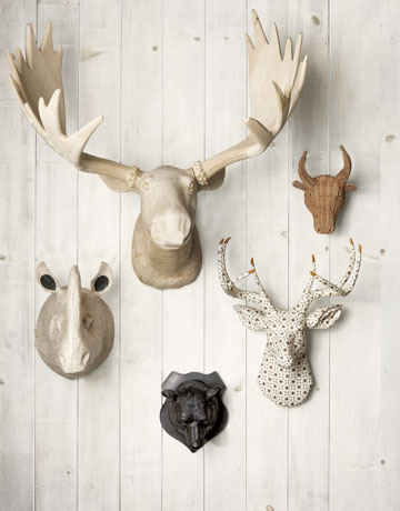 How the heck did faux, fake or real taxidermy come back into fashion? I am scratching my head. I thought it was in vogue with the shelter magazines only until I started seeing it in chain lifestyle stores and catalogs. Why, oh why, am I unable to warm up to this trend? Even the stylized pieces in white ceramic, acrylic and cable knit leave me baffled. I’d rather display my 11 year old neice’s nose-shaped pencil sharpener. (You insert the pencil into the nostril to sharpen it.)